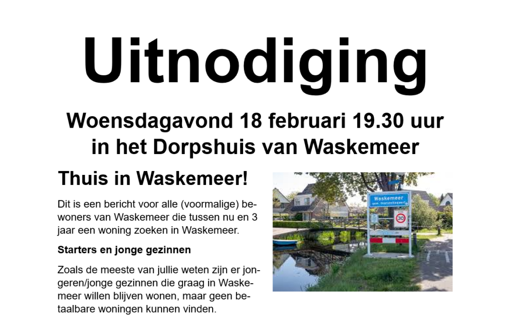 - Meer betaalbare woningen (zowel starters- als goedkope koopwoningen, sociale huurwoningen) in Waskemeer, zodat jongeren die zijn opgegroeid in Waskemeer ook in Waskemeer kunnen blijven wonen. Bouwen in eigen beheer?