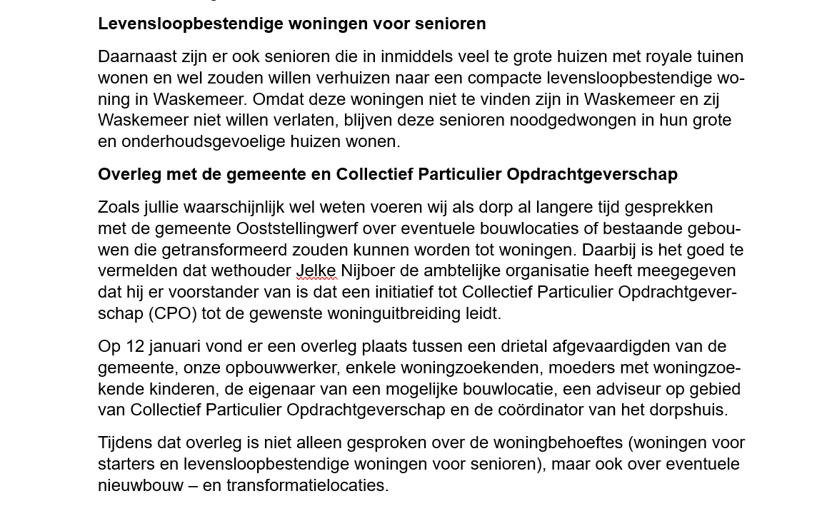 Maart ’25: M.b.t. wonen en enige bestaande vragen daaruit Katja Moesker (gemeente Ooststellingwerf, projectleider wonen) gepolst. Laten weten dat Waskemeer zich eerst samen beraadt. Katja vertelde dit: