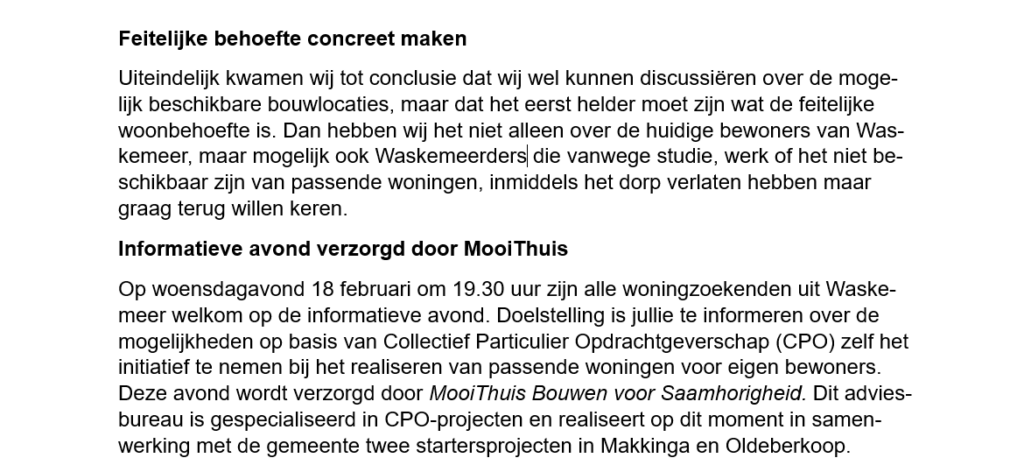 - Het zou heel fijn zijn om dingen met elkaar te kunnen regelen, m.b.t. verkoop, ook al is er begrip voor ‘willen vangen’. Voorbeeld: Waskemeerders die eerst aan onze eigen dorpelingen vertellen, dat ze binnenkort willen gaan verkopen. Wordt soms ook wel gedaan in de app, nog net even voor het naar Funda gaat. Fijn als dat gewoonte zou zijn.