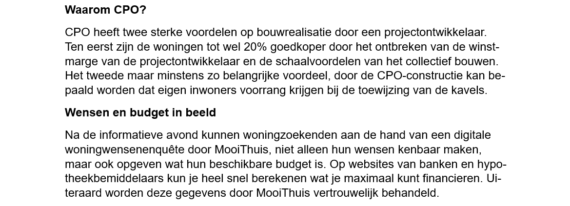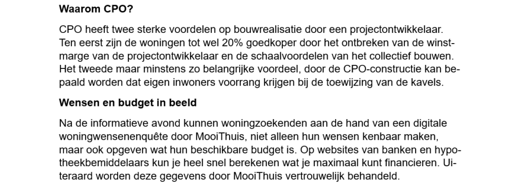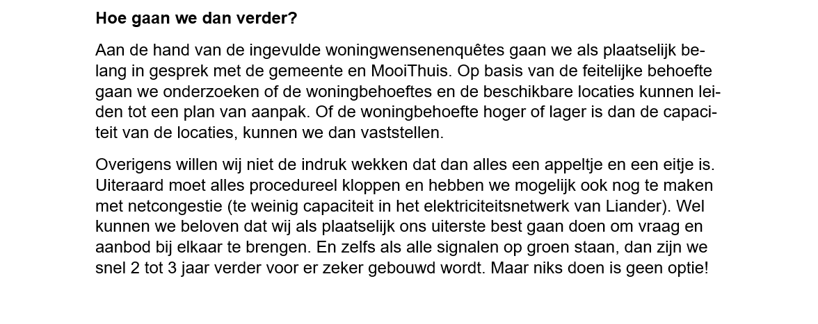 - ‘Woning: veel te groot, huis en tuin. Wil graag of verhuizen, maar liever nog een kleine woning in de tuin. Denken over verbouw, maar stagneert. Mooi zou zijn als in het gebouw meerdere huishoudens zouden kunnen gaan wonen. Er zijn wel voorwaarden: wie hier nog woont moet goede plek houden en krijgen.’